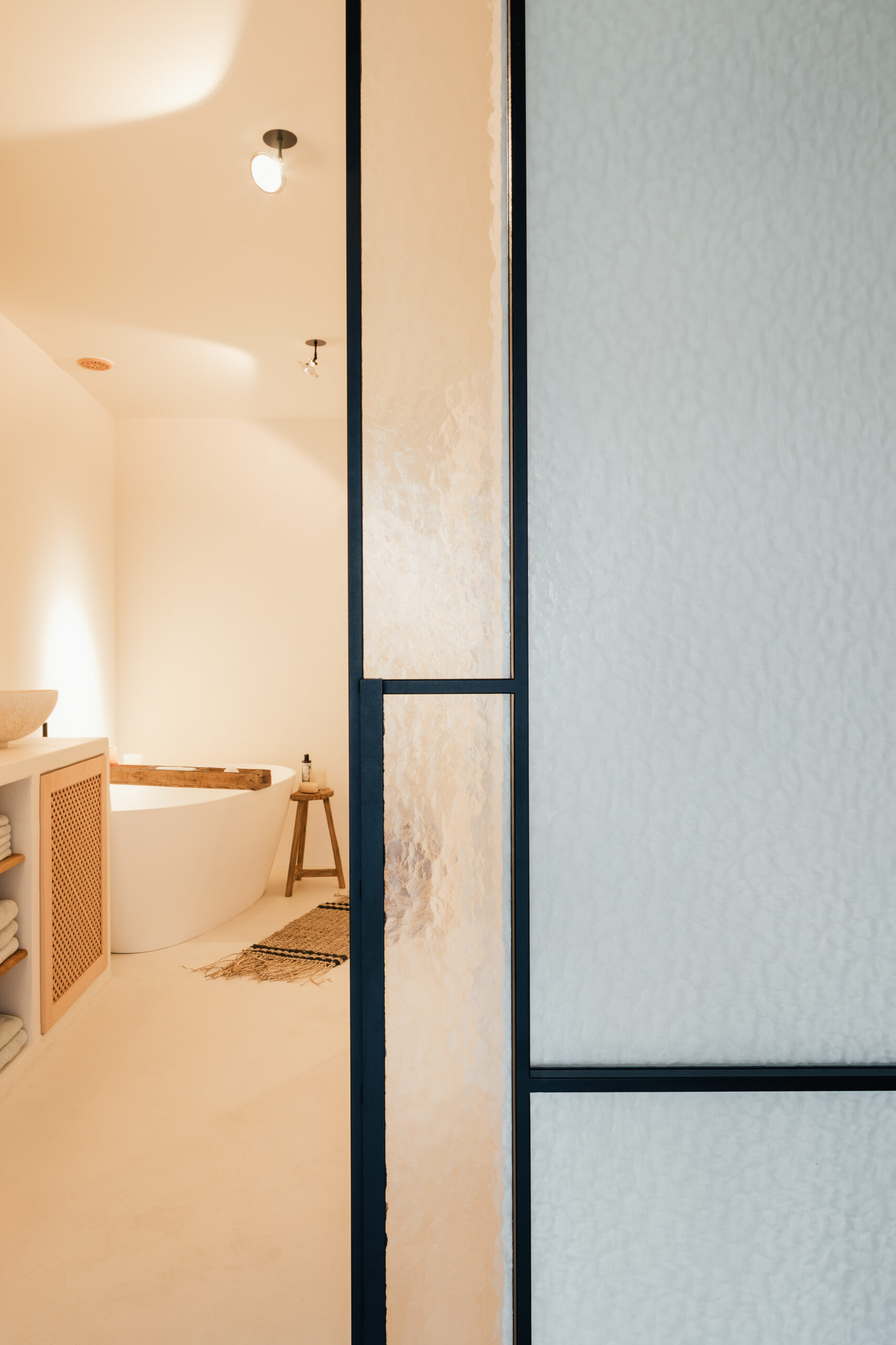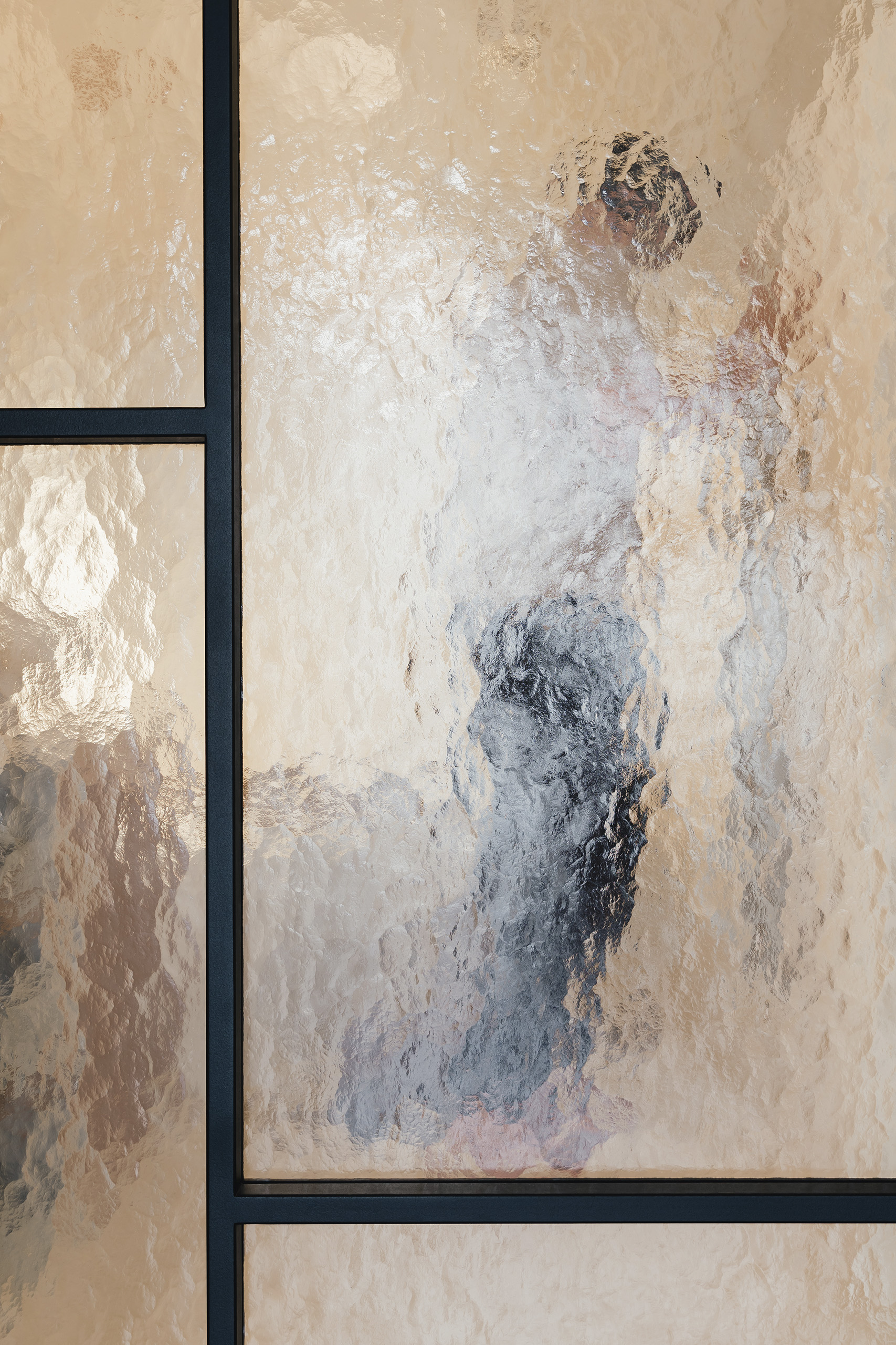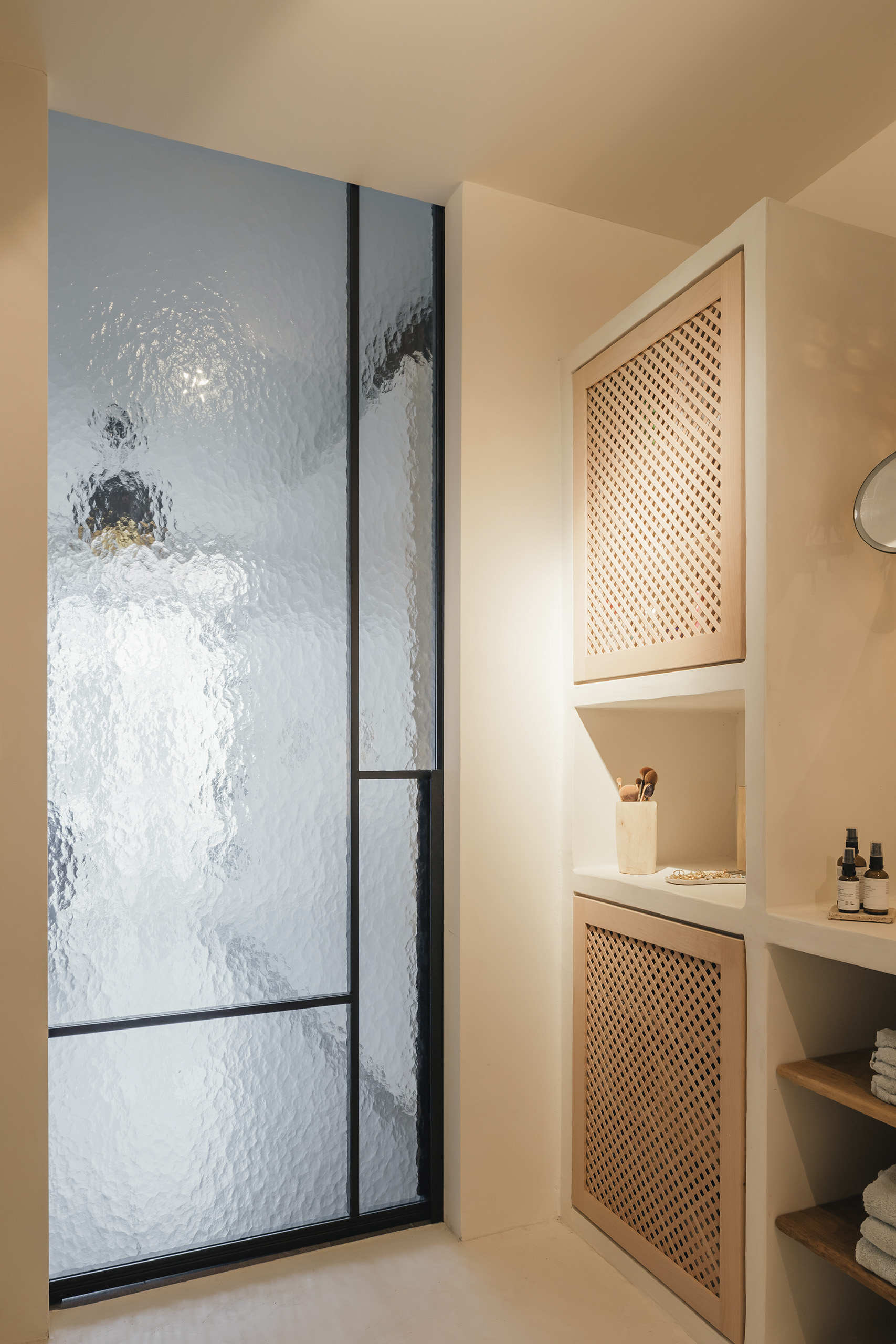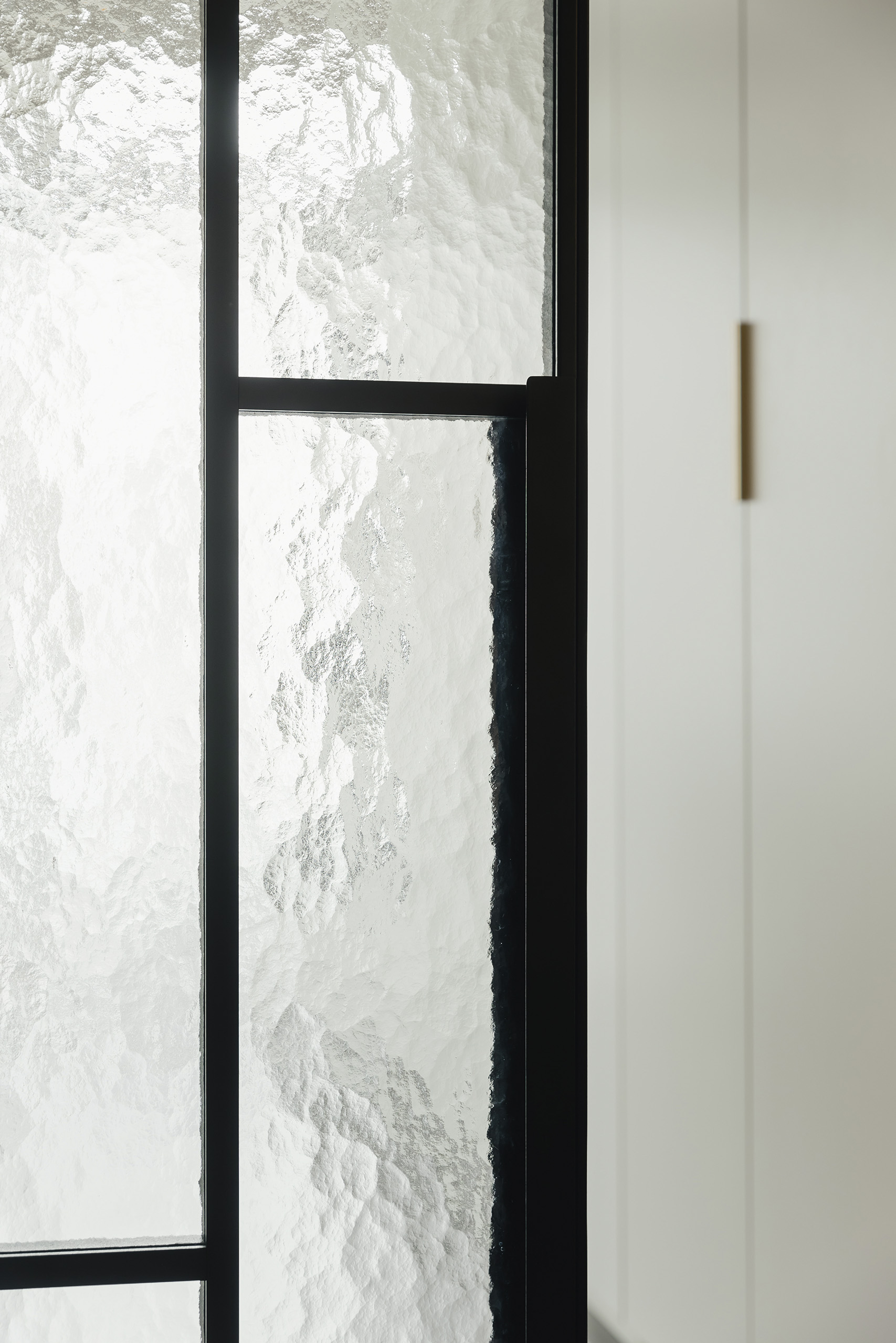 Ten projekt pokazuje jak ciekawie można zaaranżować wnętrze dzięki pięknym drzwiom ze szkłem ornamentowym. Światło płynące między pomieszczeniami pozwala na dostrzeżenie urody tego designu. Łagodna struktura szkła sprzyja ogólnemu nastrojowi tego intymnego wnętrza domu.